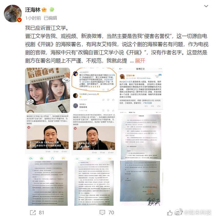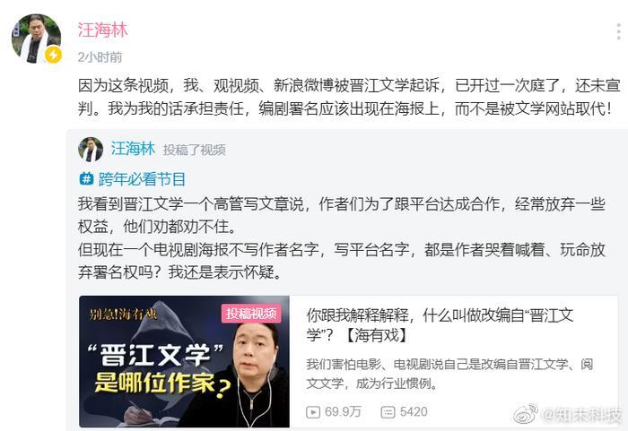 5月16日,知名编剧汪海林发动态称,“因为这条视频,我、观视频、新浪某博被晋江文学起诉,已开过一次庭了,还未宣判。我为我的话承担责任,编剧署名应该出现在海报上,而不是被文学网站取代!”