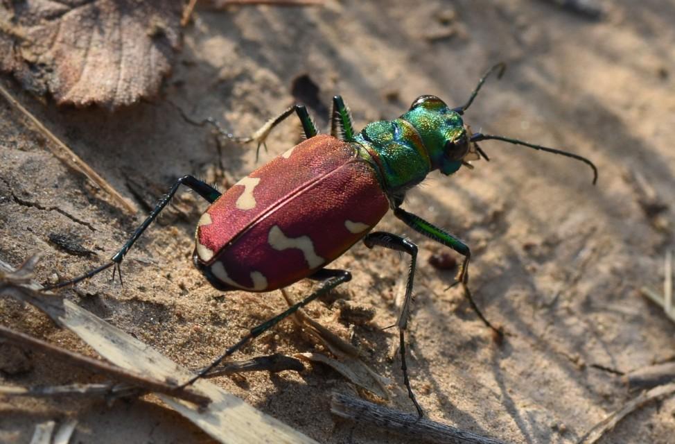 虎甲虫是昆虫纲鞘翅目虎甲科昆虫的统称,身体各部分具有强烈的金属光泽,有鲜艳的颜色和斑斓的色斑,全世界大约有2000种。虎甲虫吃起东西来一副狼吞虎咽相,因此而得名。它常在山区道路或沙地上活动,能低飞捕食小虫。有时静息路面,当人们步行在路上时,它总是距行人前面三五米,头朝行人;当行人向它走近时,它又低飞后退,仍头朝行人,好像在跟人们闹着玩。因它总是挡在行人前面,故有"拦路虎"和"引路虫"之称。它还是世界上相对速度最快的生物,它一秒可以跳到比自己身体体长171倍的地点,相当于一只猎豹用110千米/时的速度跑了18810公里。