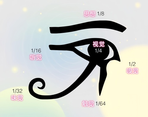 ◎〉眼睛右侧的1/2-代表嗅觉,因为最靠近鼻子;◎〉瞳孔位置的1/4-代表视觉;◎〉眉毛位置1/8被认为表示思想。◎〉眼睛左侧的1/16代表听觉,因为它指向耳朵;◎〉弯曲的下眼尾卷曲线1/32类似于种植的小麦或谷物的芽,为食物的代表,对应味觉;◎〉泪滴处1/64代表触觉,这里像植物的根茎,这是涉及身体接触和触摸的行为。