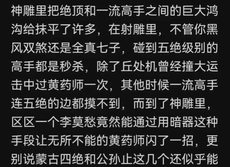 再来谈谈丘处机这一人物。他在前后两部作品中武功的变化,正是时间推移和内功修炼的结果。我们不应过于笼统地评判一个人,而是要结合时间和环境的变化来全面认识。同样的,五绝之间的力量差距在两部作品中也有所缩小,这体现了武侠世界的不断进步和发展。