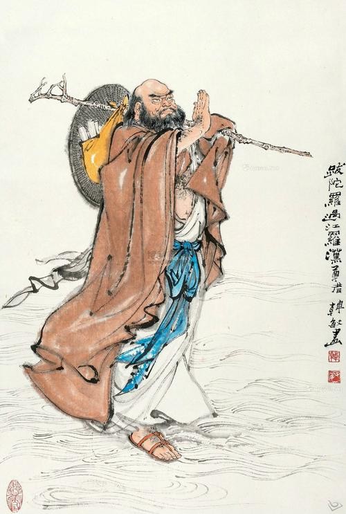 过江罗汉,全称跋陀罗尊者。他不辞辛苦,乘船到东印度群岛去传播佛法,因此被称为过江罗汉。他寓意着通达四海,象征着佛法的传播和普及,能够跨越一切障碍,让更多的人受益。
