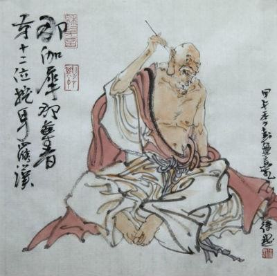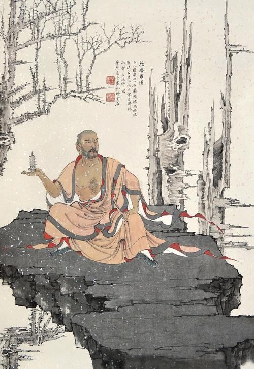 全称半托迦尊者,据说他是药叉神半遮罗之子,出生之时就已修成正果。半托迦打坐时一腿架在另一腿上,完毕时双手举起呼气,故得名探手罗汉。他的本事就是半迦坐法、神志通灵。