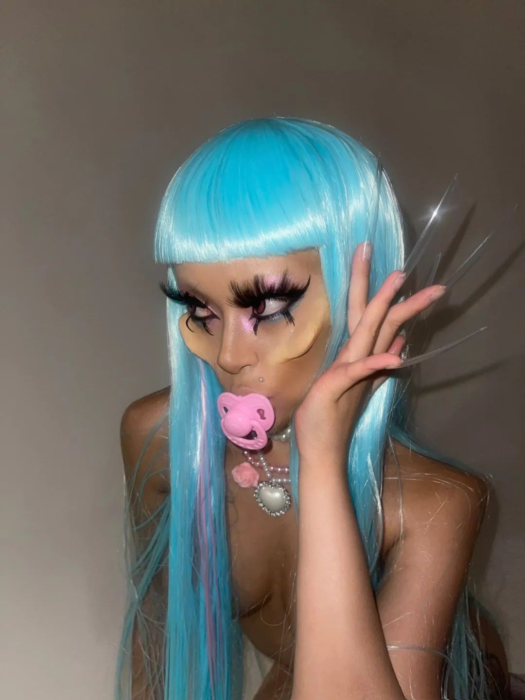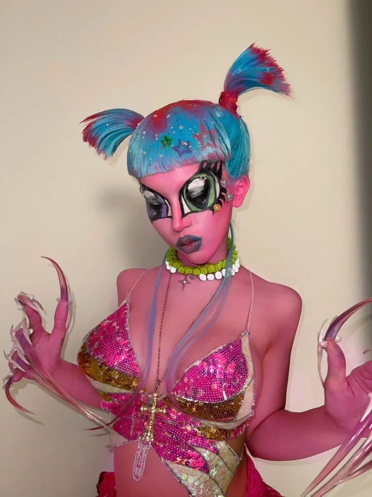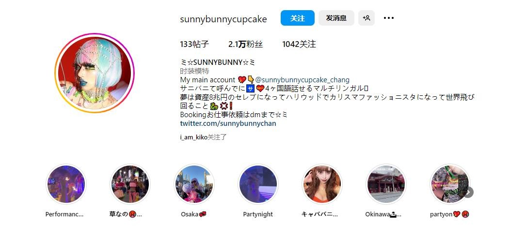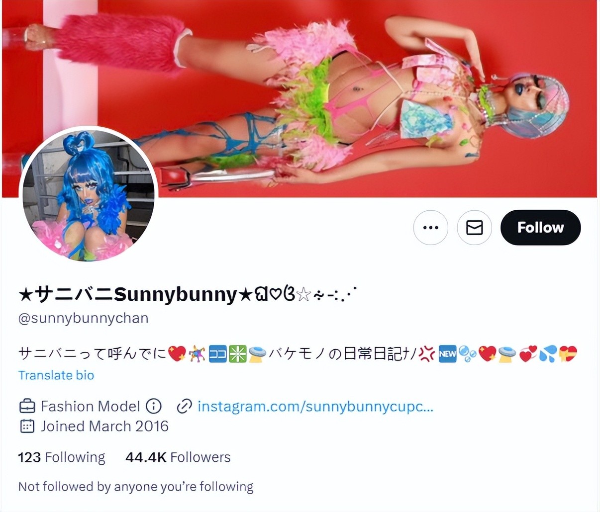 凭借夸张的妆容、调色盘的穿搭与火辣的身材,Sunnybunny 在网上获得不低的关注度,推特有着4.4万粉丝,INS上的粉丝数也有2.4万。