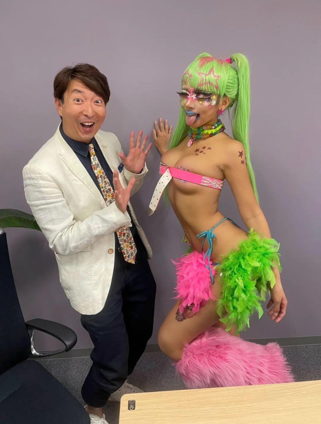 老实说朋友虽然也是辣眼,但还算正常的。而咱Sunnybunny真真是艺高人胆大啊!直接裸着上半身,上面两点仅靠彩绘遮掩......