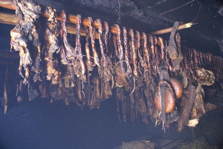 只见坐在院子里的张老汉正悠然自得地嚼着一块腊肉,一旁的三只恶犬趴在地上啃食着一些碎肉,空气中弥漫着一阵又酸又臭的味道,像是发酵了50年的泡菜。不远处厨房的墙上挂着一条条腌制好的腊肉,仔细看地上还散落着几根人类的脚指头。
