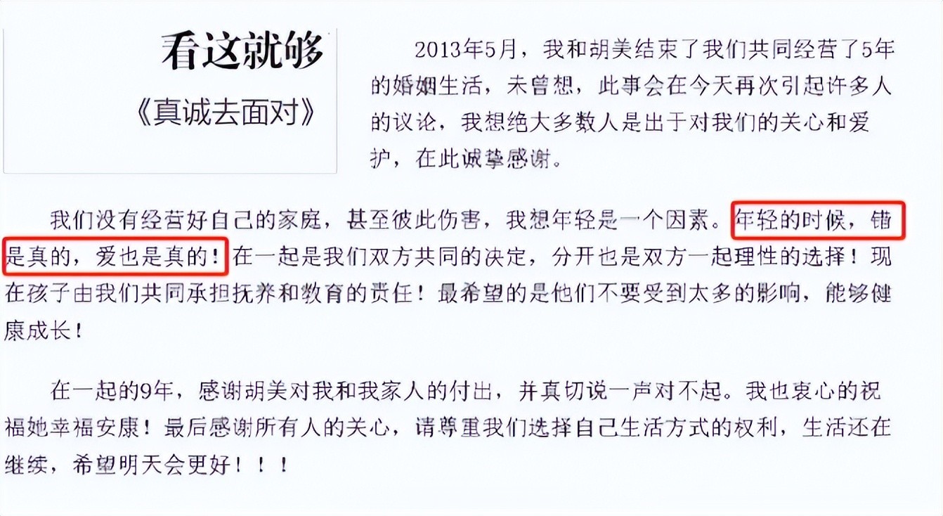 而朱芳雨也发布了声明,承认了这段婚姻的结束,他提到年轻时的自己犯了错,可真爱也确实存在过。