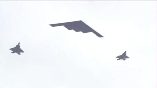 第三个出场的是美国空军的B-2A隐形轰炸机和2架F-22战斗机,在2架F-22战机的护航下,B-2A隐形轰炸机飞越林肯纪念堂上空。