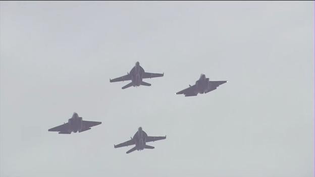 第四个出场的是美国海军的2架F/A-18E/F“超级大黄蜂”舰载机和2架F-35C“闪电II”舰载机组成的编队。
