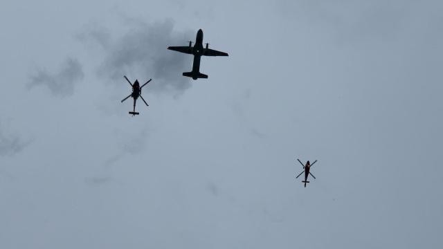 第二个出场的美国海岸警卫的MH-60T、HH-65和HC-144组成的飞行编队。当特朗普说向每一个军种致敬时,3架飞机组成的机队飞跃林肯纪念堂上空。