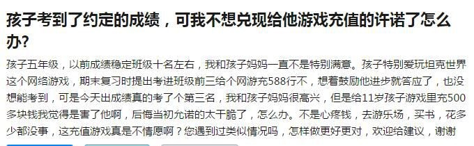 前一段时间,有人在知乎发帖,说他孩子五年级,成绩在班级十名左右,但是他不满意。因为孩子爱玩游戏,孩子就跟他提出期末考进班级前三就给游戏充588元。