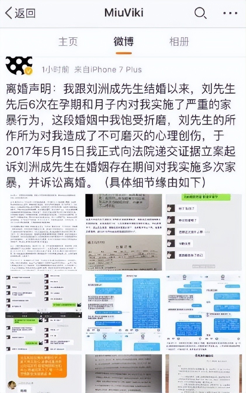 在2016年,刘洲成妻子发布长文控诉了刘洲成对她的家暴罪行,