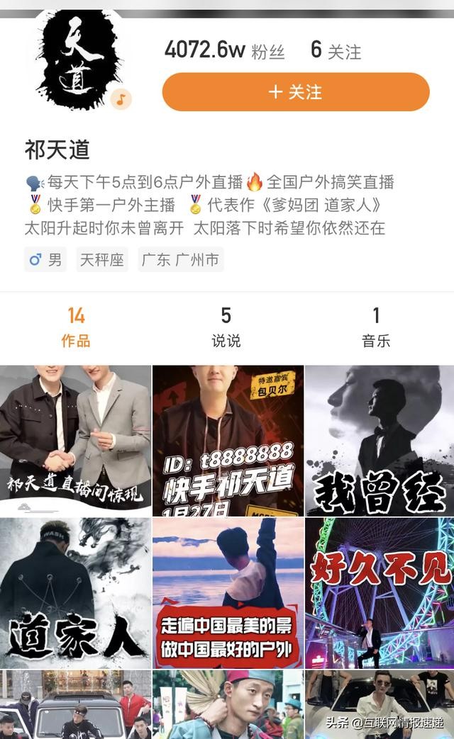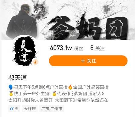 祁天道快手网红,粉丝四千多万,快手号:t8888888,微博:户外祁天道,现居地:广东 广州,祁天道主要进行户外直播。祁天道起初快手一夜刷五十万走红,后来跟散打哥、陈山走的比较近,现在是散打哥徒弟。祁天道粉丝都自称道家人。