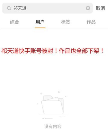 祁天道的快手账号已经搜不到了!快手正式封杀祁天道!作品也全部搜不到了,全部下架!在快手通过祁天道这个名字搜不到任何信息了。