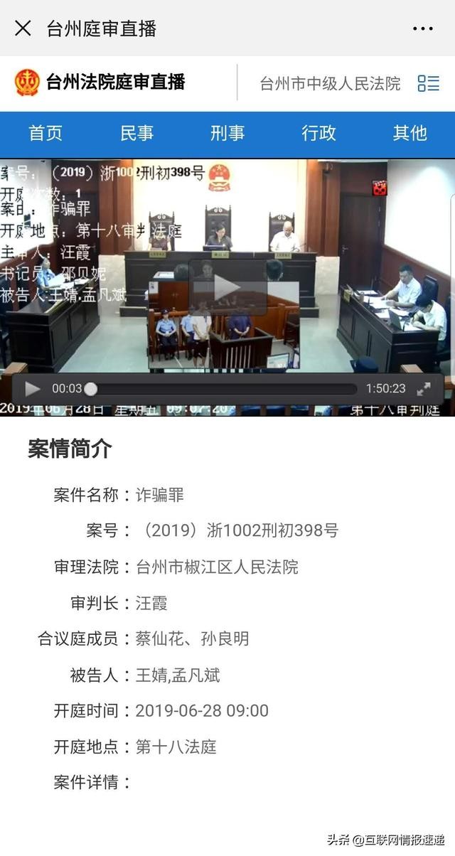 网上流出的此前开庭视频中显示,在庭审现场,法官当庭宣布:被告人王婧、孟凡斌以非法占有为目的,结伙利用网络技术手段,虚构事实诈骗他人财物,王婧参与期间诈骗团伙共计骗取人民币366万余元。孟凡斌参与期间诈骗团伙共计骗取人民币335万余元。数额特别巨大,其金额已经触犯中华人民共和国《刑法》第266条第25条第一款,犯罪事实清楚,证据确实充分,应当以诈骗罪追究其刑事责任。