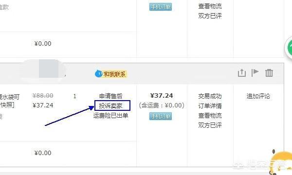 3、在订单后面我们会看到有“投诉卖家”的选项。注意必须在退款成功且交易状态为“交易关闭”的15天内,或者在交易状态为“交易成功”的15天内,否则会出现投诉入口已被关闭的提示。