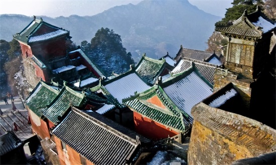 大岳太和宫建在众峰拱托、直插云霄的武当最高峰——天柱峰的绝顶上。在海拨1612米的巅峰绝顶上建造规模宏大的道宫,更多地体现出的是一种前无古人的气魄和征服者胜利的昭示,武当山特殊的地貌形成的众峰拱托、八方朝拜的景观也神奇地渲染出皇权的至高无上。大岳太和宫是武当山的最高胜境,无论是道人信士,还是香客游人,只有登上顶峰,走进太和宫,才是真正意义上的到了武当山。明嘉靖年间,太和宫又进行了扩建,使殿堂道房多达520间。而在那次扩建之后,这里的称谓有了变化,以金顶围墙为界,墙外面的称为“太和宫”,墙里面叫“紫金城”。“北有紫禁城,南有紫金城”,可见当时大岳太和宫的地位仅次于北京的皇宫了。整个工程历时五年完工,用巨型条石砌筑的城墙周长344米,居险临危却又坚固稳重,犹如一道光环围绕金顶,让人叹为观止。城墙上按东西南北四方建筑了四座天门,以象征天阙。四座天门临绝云空,极力渲染天庭仙界的威严