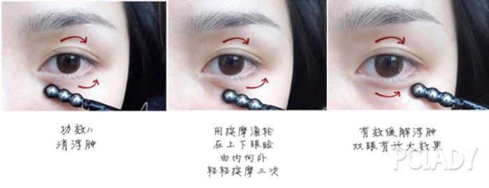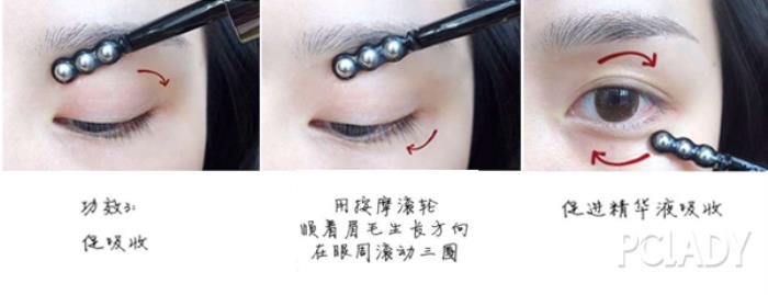 Step3:用滚轮顺着眉毛生长方向在眼周滚动三圈,促进精华液吸收。