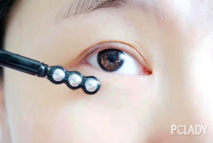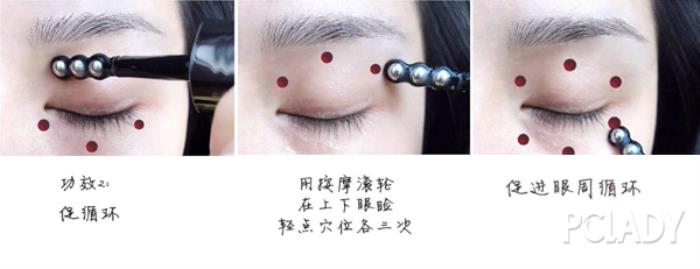 Step2:然后用按摩滚轮在上下眼睑由内到外轻轻点穴位各三次,促进眼周血液循环;