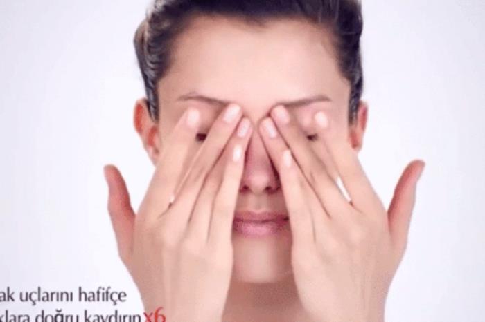 按摩之后,涂抹眼部精华。取珍珠粒大小的分量,用双手无名指以点压的方法均匀地涂在眼睛周围。先由下眼睑之眼尾向内眼角轻按,再由上眼睑的眼角处向外轻按至眼尾,如此循环2至3次。