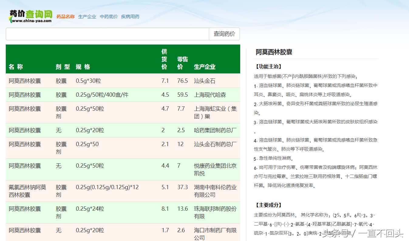 网站很简洁,就是搜索框和搜索按钮,在输入框里输入我们要查询的药品,然后搜索就可以了,结果会出来一个列表。有药品名称、剂型、规格、供货价、零售价和生产企业。我是以阿莫西林胶囊为例搜索的,图片就是显示的结果。