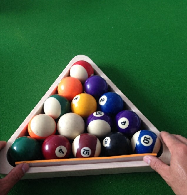 美式落袋台球(平常所玩的16个球的台球)用三角架将15个彩球摆成三角形,8号球摆放在第三排中间,其余全色和花色球要尽量差开摆放。