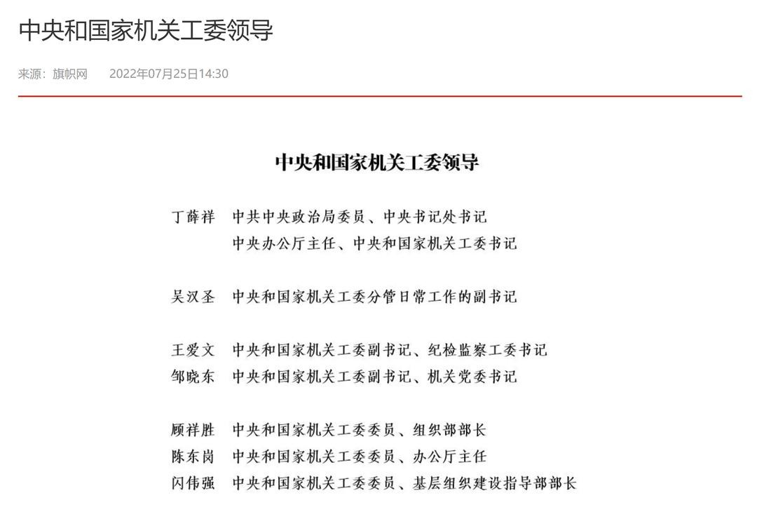 7月25日下午,中央和国家机关工委官网旗帜网“中央和国家机关工委领导”栏目更新信息显示,王爱文已任中央和国家机关工委副书记、纪检监察工委书记,任正晓不再担任中央和国家机关工委副书记、纪检监察工委书记,郭文奇不再担任中央和国家机关工委副书记职务。