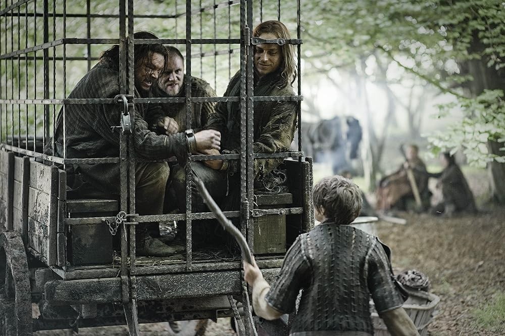 不久后,尤伦的队伍遭到了兰尼斯特家族军队的袭击。招募者尤伦被杀,在混乱中,一个火把掉在了贾昆·赫加尔所在的木笼旁边。栏杆着火了,三个罪犯处于死亡的边缘。