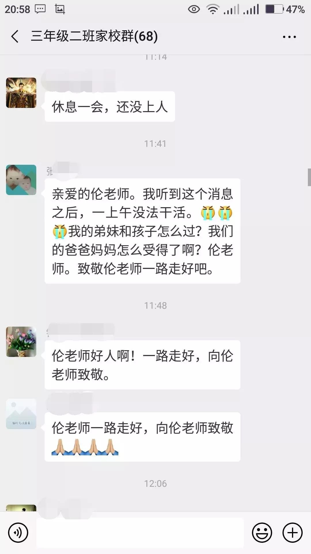 “我是小轩(化名)的家长,我虽然和伦老师不熟悉,但是我知道后告诉了小轩,小轩说不可能,说要给老师打电话。我感觉伦老师对学生都挺好的,愿伦老师一路走好!”在三年级二班的家校联系微信群中,家长们纷纷表达哀悼、难过之情,并向伦老师致敬。