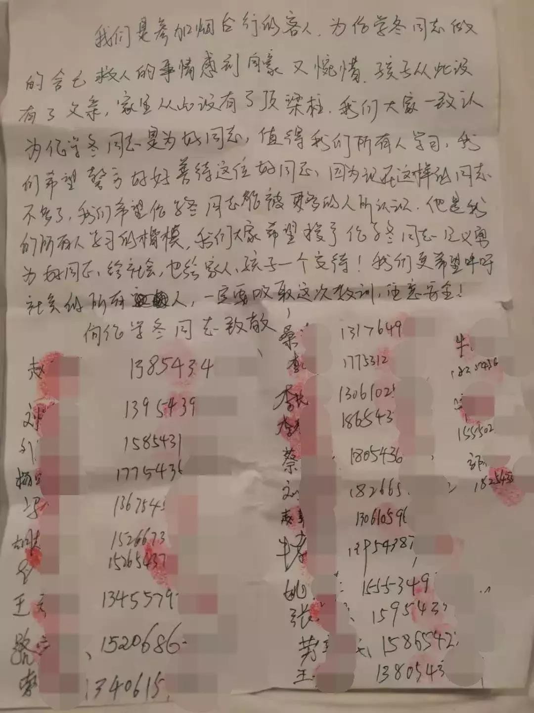 我们是参加烟台行的客人,为伦学冬同志做的舍己救人的事情感到自豪又惋惜。孩子从此没有了父亲,家里从此没有了顶梁柱。我们大家一致认为伦学冬同志是好同志,值得我们所有人学习。我们希望警方好好善待这位好同志,因为现在这样的好同志不多了,我们希望伦学冬同志能够被更多人所认识,他是我们所有人学习的楷模,我们大家希望授予伦学冬同志见义勇为好同志,给社会,也给家人、孩子一个交待!我们更希望呼吁社会的所有人,一定要吸取这次教训,注意安全!向伦学冬同志致敬!