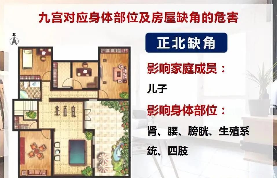 正北方缺角,可能会影响次子的学业和事业,还可能导致泌尿系统方面的问题。