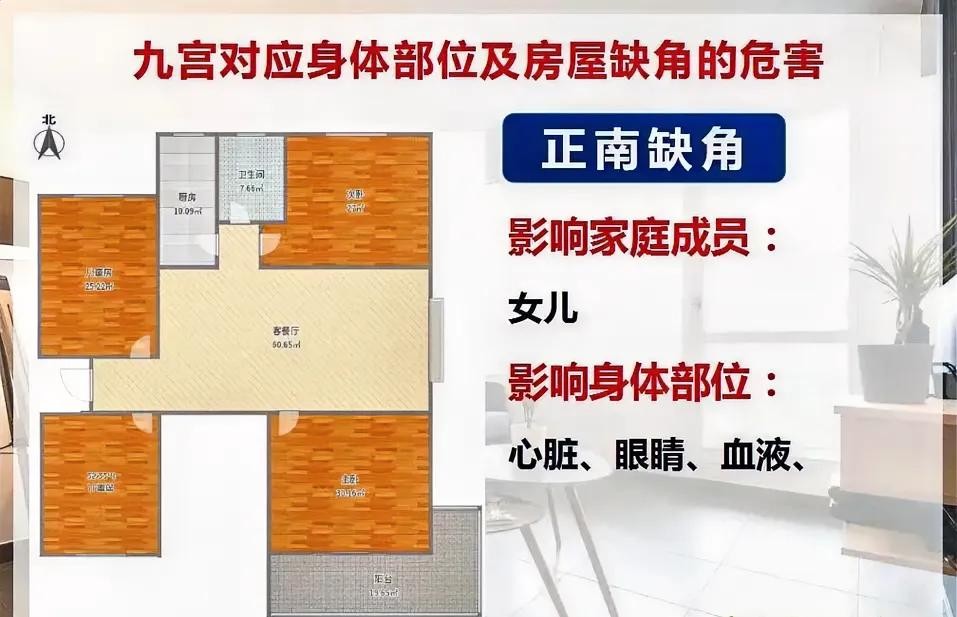 正南方缺角,对家人的眼睛、心脏和血液系统健康不利。
