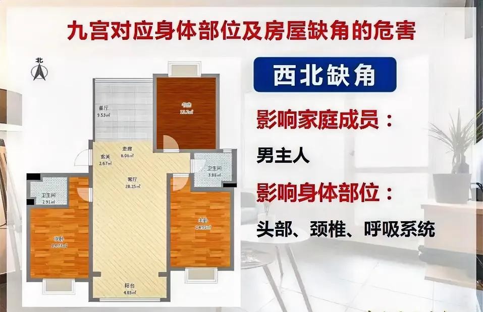 如果西北方缺角,善友们可得小心了,这可能会影响男主人的身体健康、事业运势以及婚姻状况。