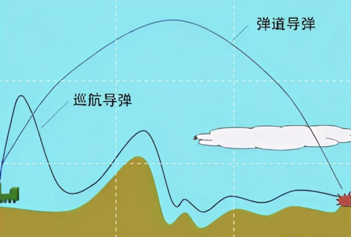 弹道导弹的弹道就像一个抛物线,导弹在火箭发动机强大的推力下飞行到一个最高点后,再借助地球引力自由落体击中目标。也就是说弹道导弹的弹道是是一个最高点很高的抛物线。而巡航导弹则不同,虽然巡航导弹发射后也会爬升到一定高度,但是很快就会下降到一个较低的高度,并保持在此高度飞行,待接近目标后再次爬升俯冲击中目标或直接击中目标。