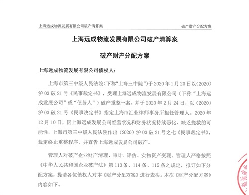 12月5日消息,远成物流破产资产第一次分配方案公布。