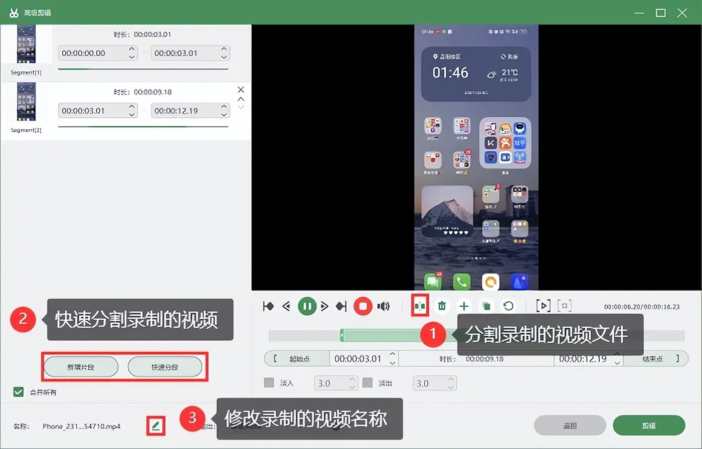 第3步:点击红色“录制”按钮,软件将开始录制我们的oppo手机,录制结束后,视频将弹出预览,可以选择直接保存视频或者对视频进行修剪。