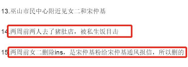两周前,宋仲基和女方一起去了猪肚店,被私生饭目击,似乎有人整理了宋仲基出轨的实料打算报料,于是宋仲基粉丝给宋仲基通风报信,女方删除了可能会暴露信息的ins,而之前传宋慧乔也是收到私生饭的爆料,才一怒之下删了ins。