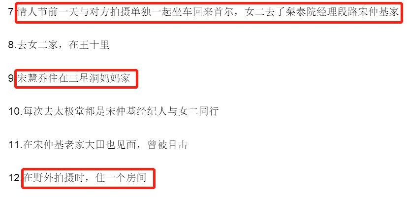 宋仲基还被目击到与金玉彬拍摄单独一起坐车回首尔,女方还去了宋仲基位于梨泰院的某一住所,两人在野外拍摄时也是住一间房间,现在宋慧乔住在了三星洞妈妈家,似乎和宋仲基已经分居了。