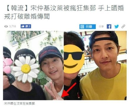 3月9日,有媒体拍到宋仲基私下戴上婚戒的照片,表示双宋夫妇感情依旧非常好,“婚变传闻”无中生有,但是随后爆出宋仲基戴着婚戒和别人的合影是很早之前的,而宋仲基的确婚内不忠,引起网友的关注。