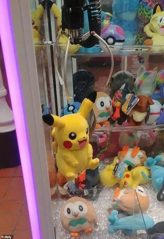 玩娃娃机抓到了皮卡丘,但是挂绳被挂到抓爪上。