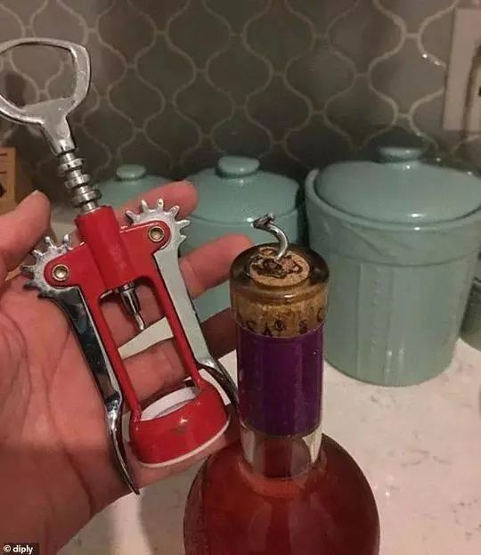 开葡萄酒时,开瓶器卡在顽固的软木塞中,