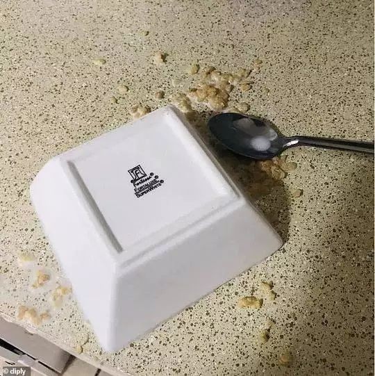 装牛奶麦片的碗倒扣摔在地上,早餐被毁了。