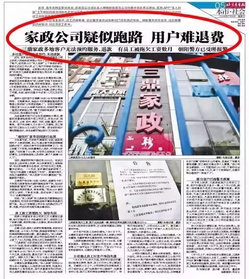 三鼎家政多地客户无法预约服务、退款 有员工被拖欠工资数月,朝阳警方已受理报警。