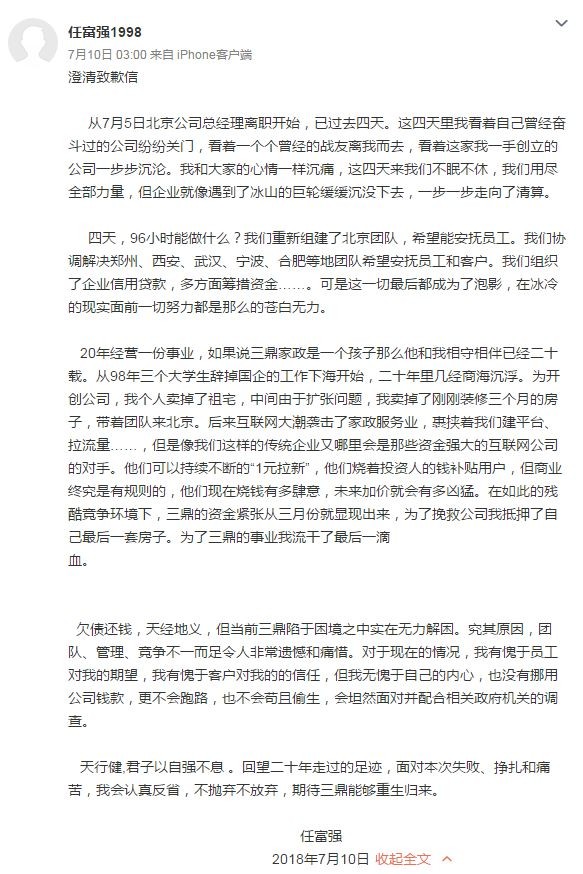 7月10日凌晨,三鼎家政公司董事长、三鼎家政创始人之一任富强发出了澄清致歉信,表示三鼎家政的资金紧张从三月份就显现出来,已在组织企业信用贷款,多方筹措资金。信中表明,对于三鼎目前陷入的资金困境,无力解困,但是仍旧秉持着“欠债还钱,天经地义”的态度。