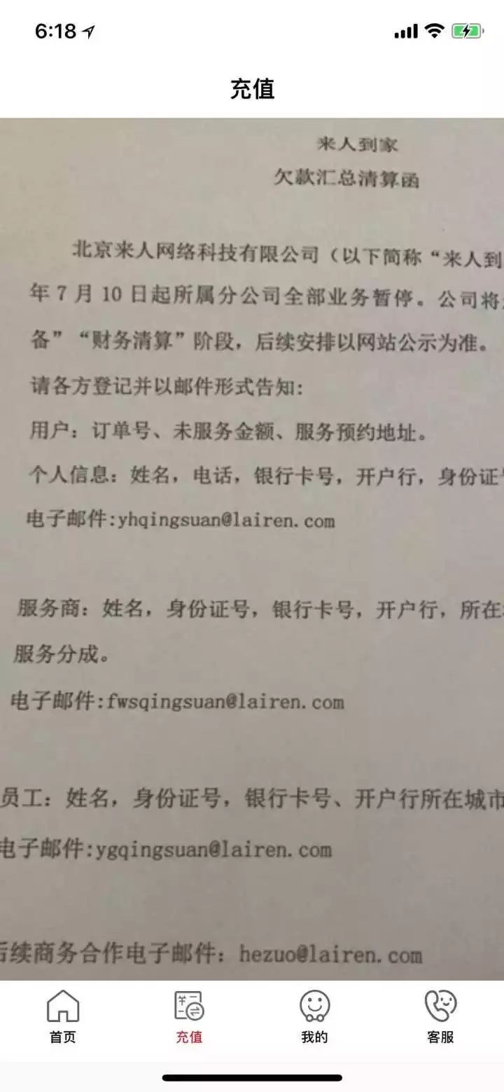 苹果应用商城里,“来人到家”APP暂未下架,仍然可以下载,下载之后点击“充值”,页面会跳出“来人到家欠款汇总清算函”的图片。