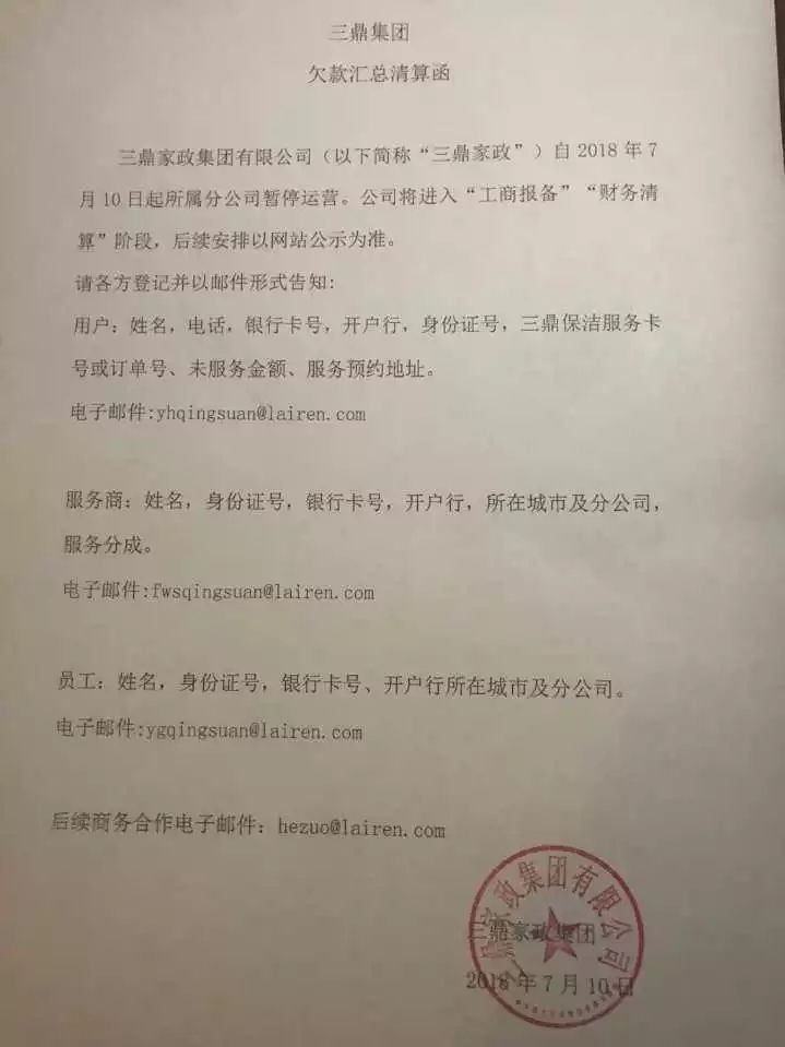 7月10日,三鼎家政官网发布清算通知:三鼎家政集团有限公司自2018年7月10日起所属分公司暂停运营。公司将进入“工商报备”“财务清算”阶段,后续安排以网站公示为准。并表示,请用户、服务商、员工将情况以邮箱形式告知。