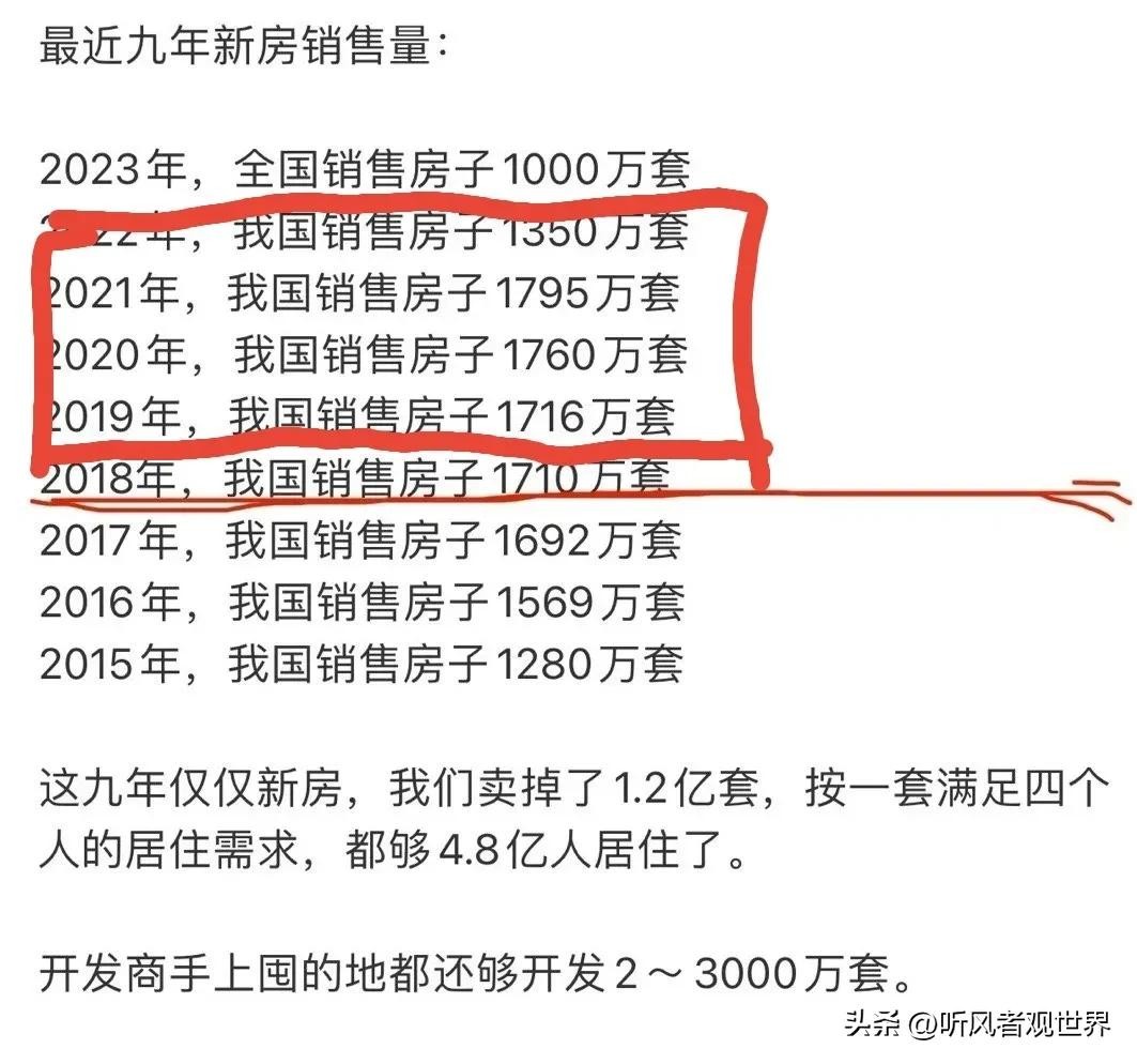 2015年至2023年短短九年时间,全国新建住宅销售1.3872亿套,按一套3人的居,满足4.16亿人居住,按照一套3.5人居住 满足4.86亿人居住。目前国内开发商手上囤积的土地都还能够开发2000~3000万套住房。