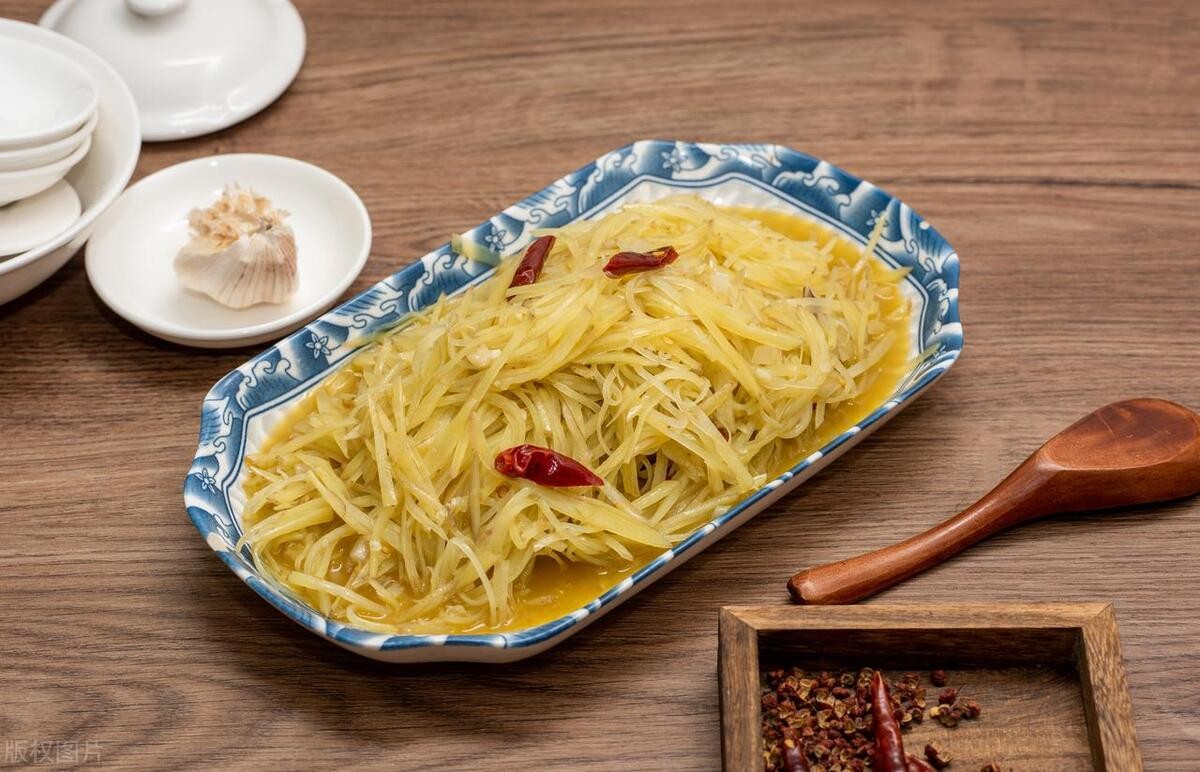 4.加入醋、盐和白糖调味,煮至土豆丝熟透后起锅即可。