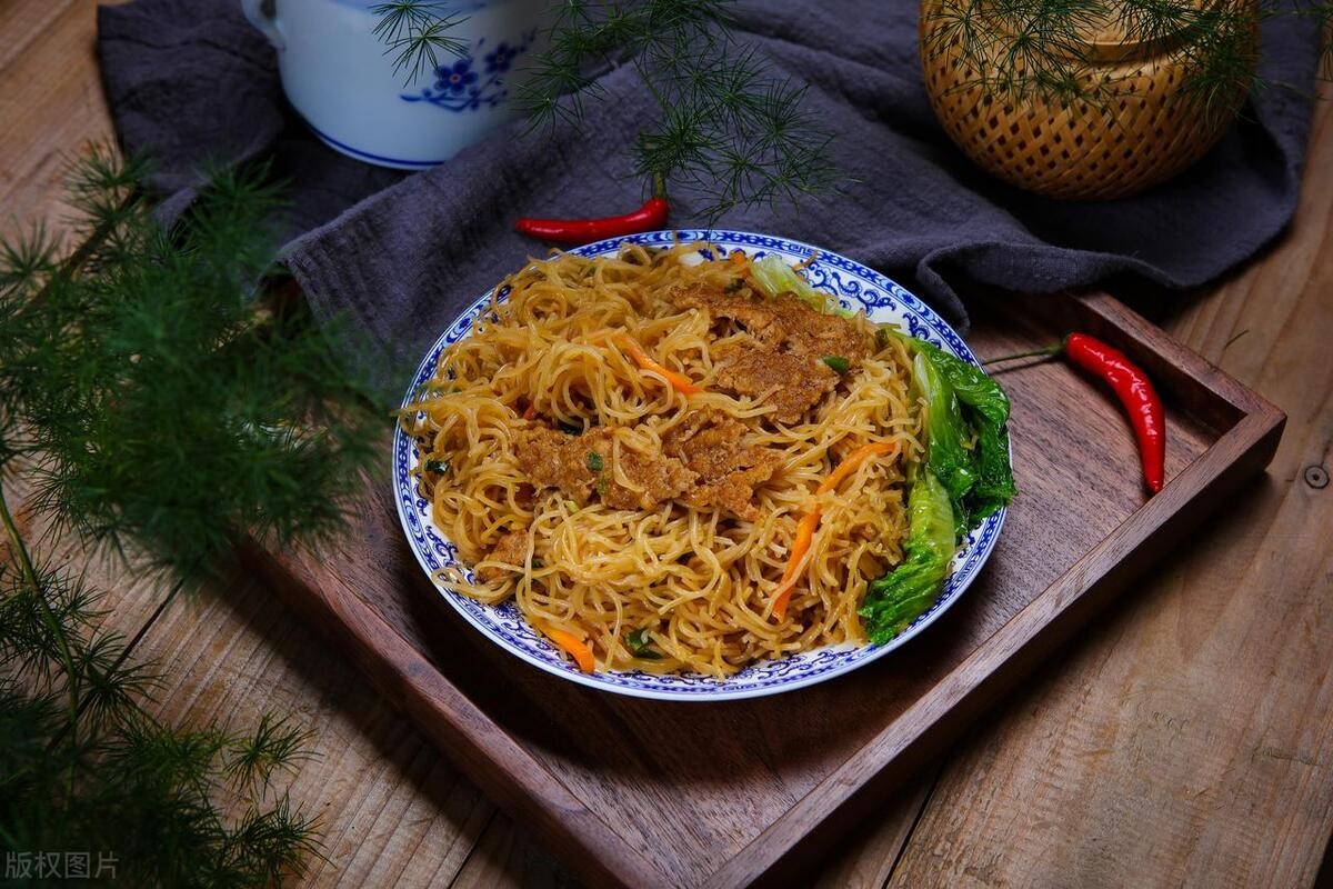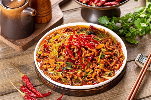4. 加入肉丝煸炒至变色,放入腐竹继续翻炒。