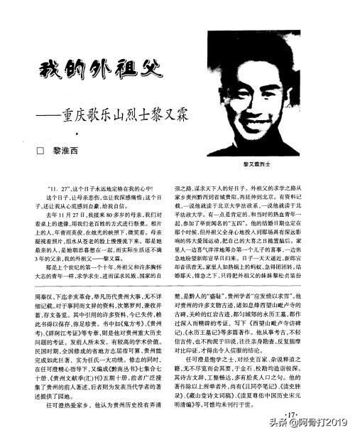 黎又霖(1895—1949),初名幼林,字万里,贵州黔西县人,是中国唯一的六重党籍革命烈士,曾先后加入国民党、中国共产党、民联、民盟、民革、农工党等党派。参加过五四运动、北伐战争、福建事变、抗日战争、解放战争,长期从事民主革命活动,曾担任过《民生报》主编、上海同济大学教授、中国国民党革命委员会四川省委负责人等职务。1949年11月27日,被国民党特务枪杀于"白公馆"后山松林坡。