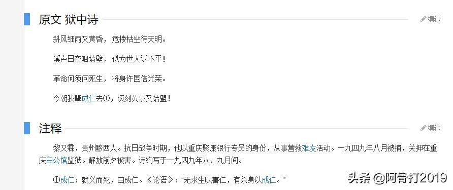 11月30日重庆解放,刚从敌人大屠杀中侥幸脱险的王国源同志,在白公馆监狱平三室牢房的隐蔽处,发现了一张巴掌大的纸片,那上面用竹签子笔写着几行感人肺腑的诗句。经确认,它是黎又霖烈士在牺牲前两天,即1949年11月25日在狱中写下的绝命诗。